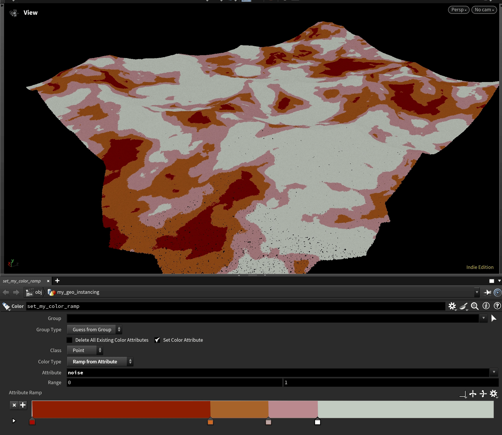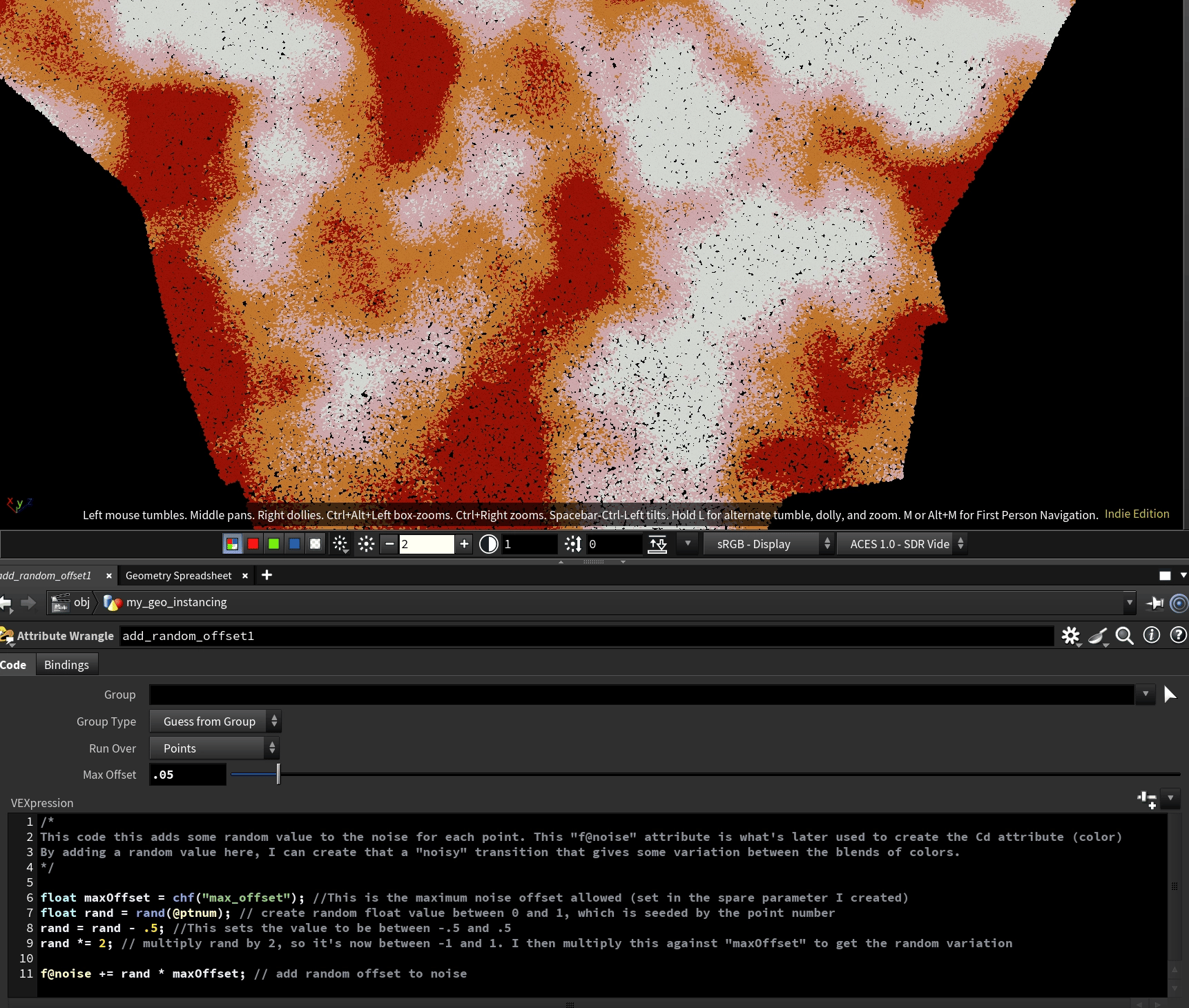 A trick I did to get some slight variation between the color transitions on this noise was add a random value to the "f@noise" attribute I used to then create the color. The image just below here is what the noise looks like without this random value added.