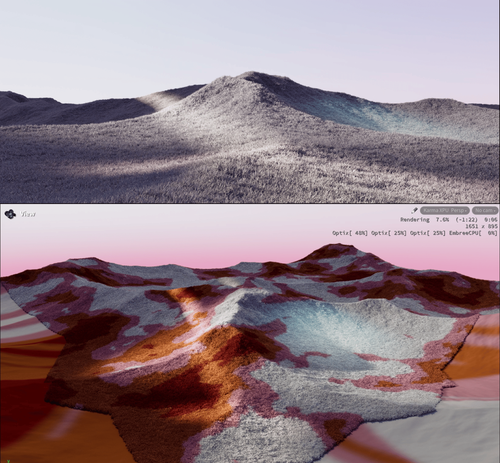 This noise I then remapped to get the general color of my landscape. Each point here had a final Cd color that I then sampled in the material using a "primvar reader" in solaris. (NOTE: by default the Cd attribute is imported into Solaris and renamed to "displayColor", so you can either fetch the displayColor primvar, or you can rename the Cd to something different in SOPS, and then reference that new name that won't be changed by default).